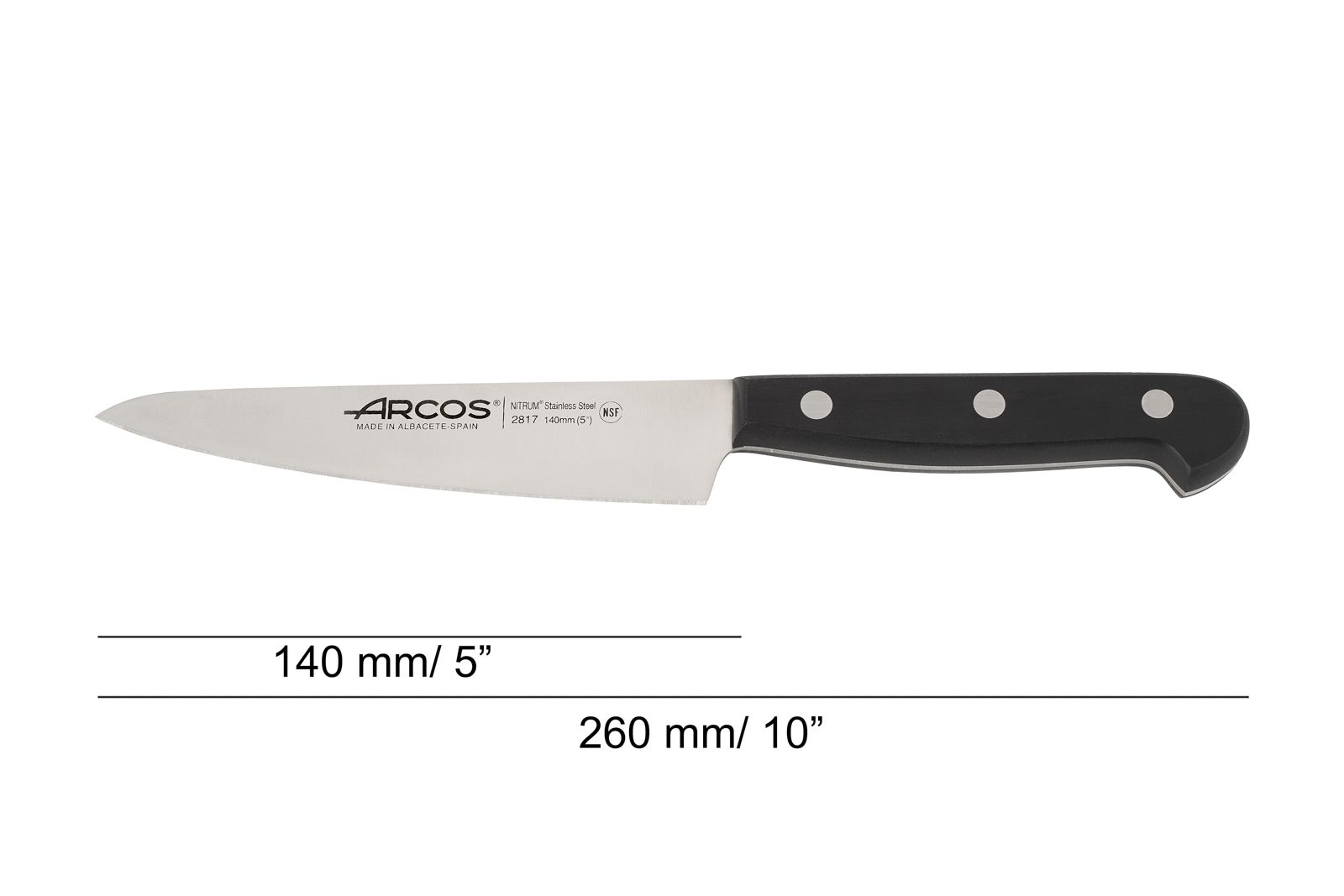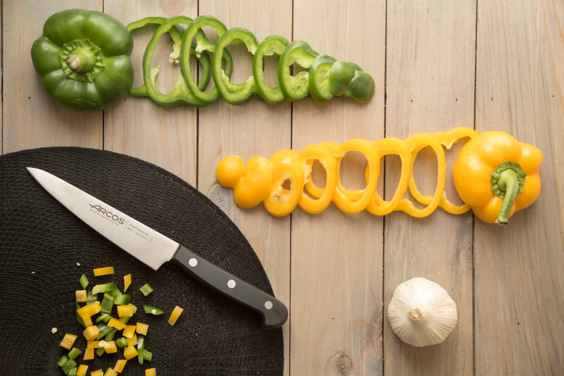 - Cuchillos con hojas afiladas, fabricadas en acero inoxidable NITRUM®, y mango de polipropileno.