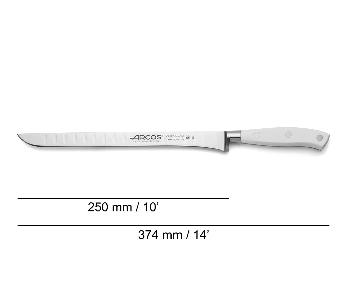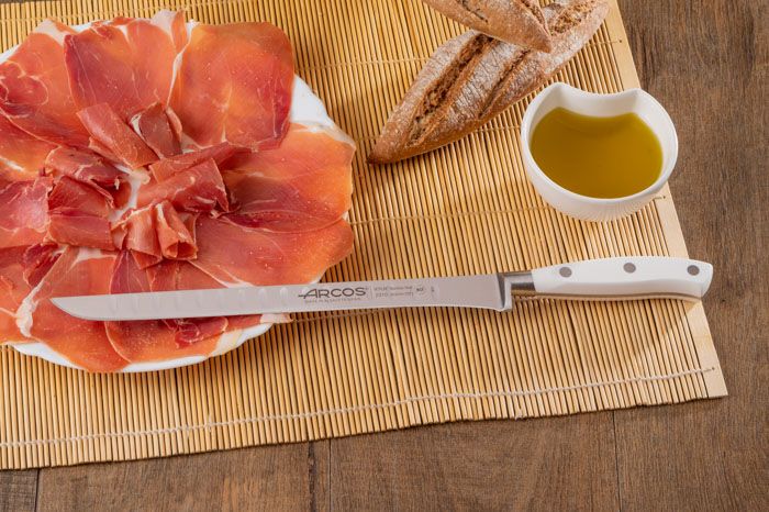 - Cuchillo Jamonero de 250 mm de hoja. El mango se distingue por su color blanco y la virola de estilo francés. Evita deslizamientos y cortes indeseados.