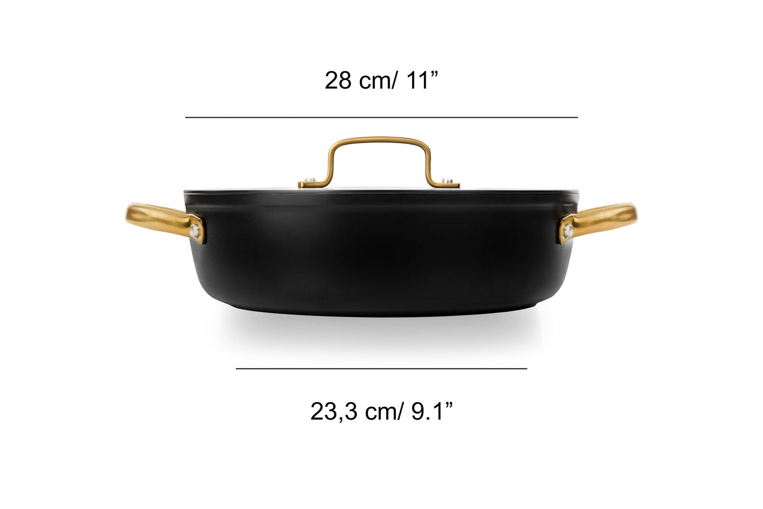 La batería incluye: cacerola de 20 cm, cacerola de 24 cm, cacerola de 28 cm, sartén de 20 cm, sartén de 24 cm, sartén de 28 cm y cazo de 16 cm.