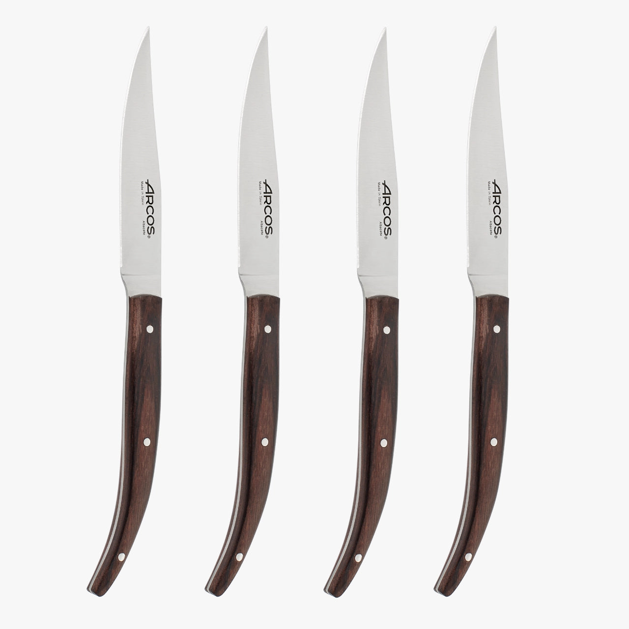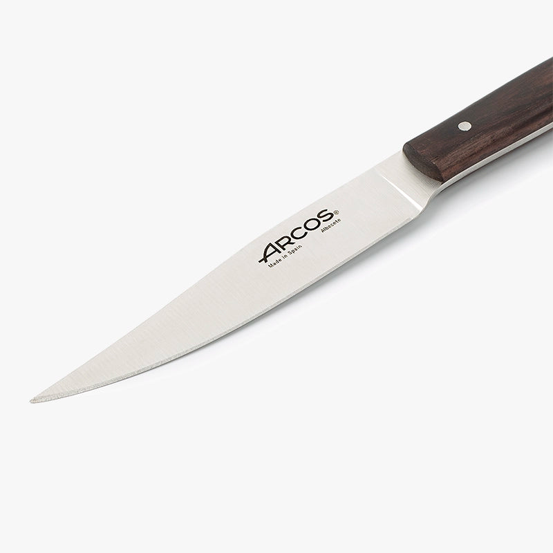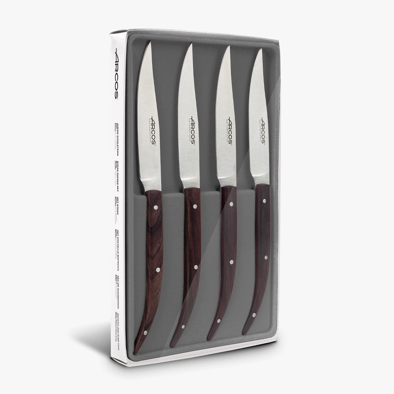 Este jogo de facas chuleteiras The Origin é composto por 4 facas estilo navalha, perfeitas para cortar carnes ou filés de maneira fácil e sem esforço. É projetado nos estúdios de Albacete, Espanha, por mãos especializadas em cutelaria desde 1734. Arcos se caracteriza por combinar tradição com tecnologia de ponta em cada um de seus produtos.