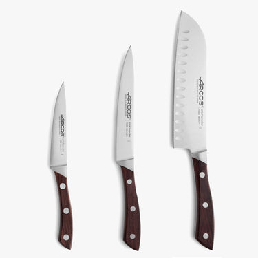 Conjunto de cozinha de 3 facas série Natura, da Arcos, contém uma faca descascadora de 100 mm, uma faca de chef de 160 mm e uma faca santoku de 180 mm.