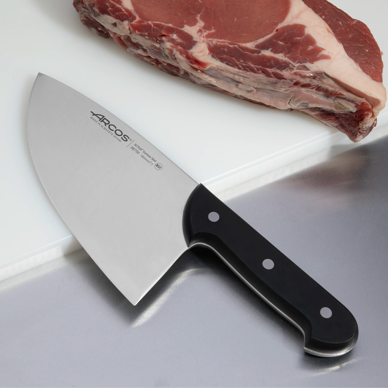 Cutelo para costeletas da série Universal, ideal para cortar grandes pedaços de carne, graças à sua lâmina larga e estável de 180 mm com forma retangular.