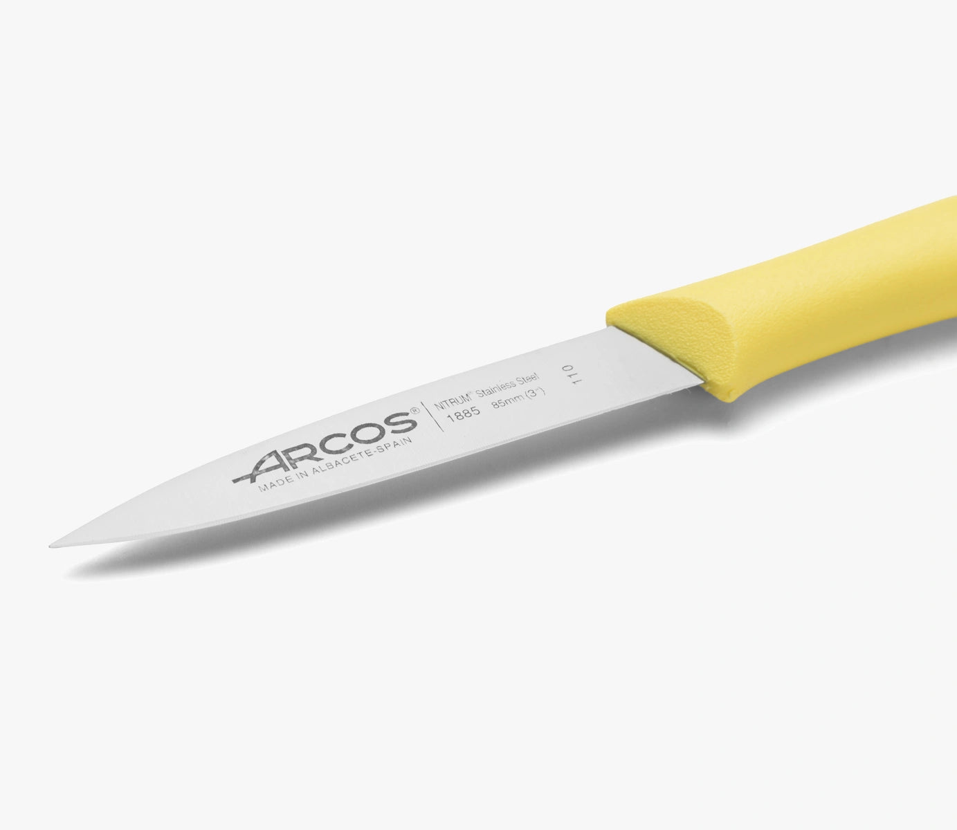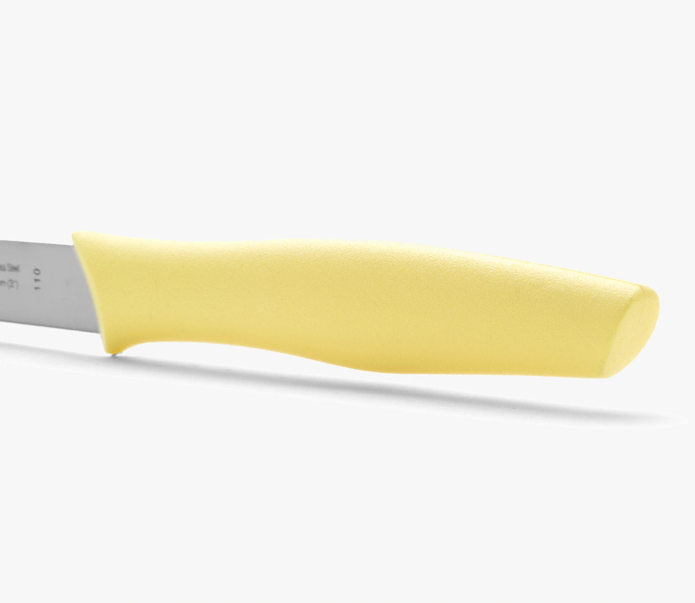 El cuchillo mondador color limón serie Nova 85 mm tiene una puntilla filuda. Ha sido diseñada para pelar y limpiar las frutas y hortalizas.
