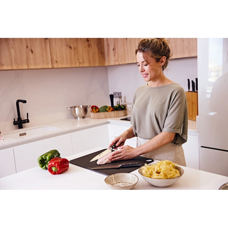 - Virola com meia defesa, que torna o processo de corte e afiação mais fácil. Além disso, confere um toque moderno e elegante a este utensílio.