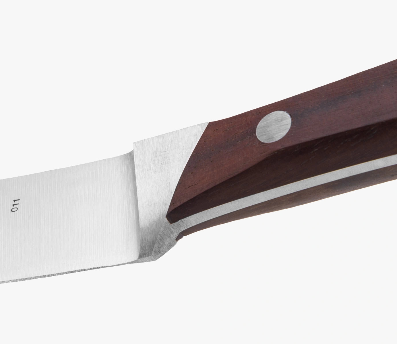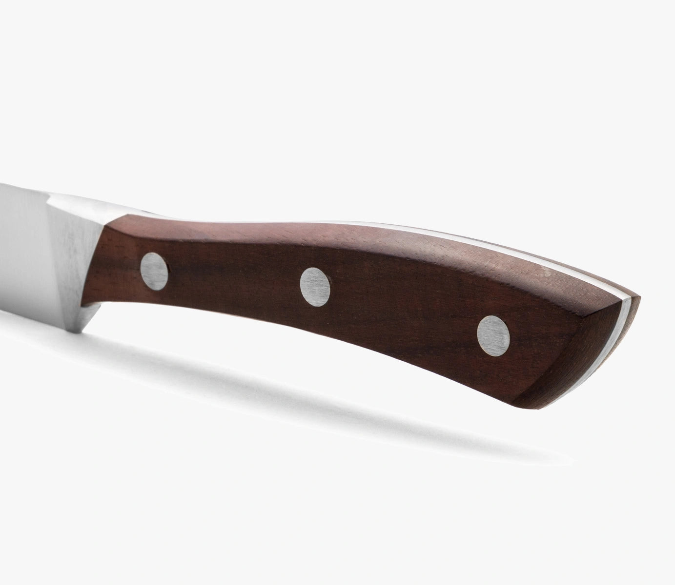 - O cabo é composto por 2 peças de pau-rosa, madeira de textura rústica que é antiderrapante e muito resistente. Fixado à espiga com 3 rebites inoxidáveis.
