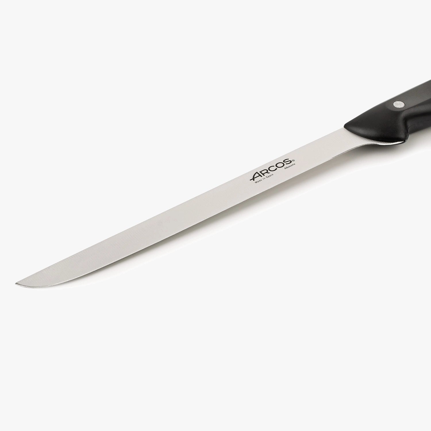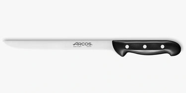 A faca para presunto é fabricada com uma lâmina de 240 mm de aço inoxidável, com cabo de polipropileno (PP) e rebites inoxidáveis, sendo ideal para cortar facilmente e obter fatias de presunto sem esforço. Sua lâmina longa, fina, flexível e seu fio liso são ideais para essa tarefa.