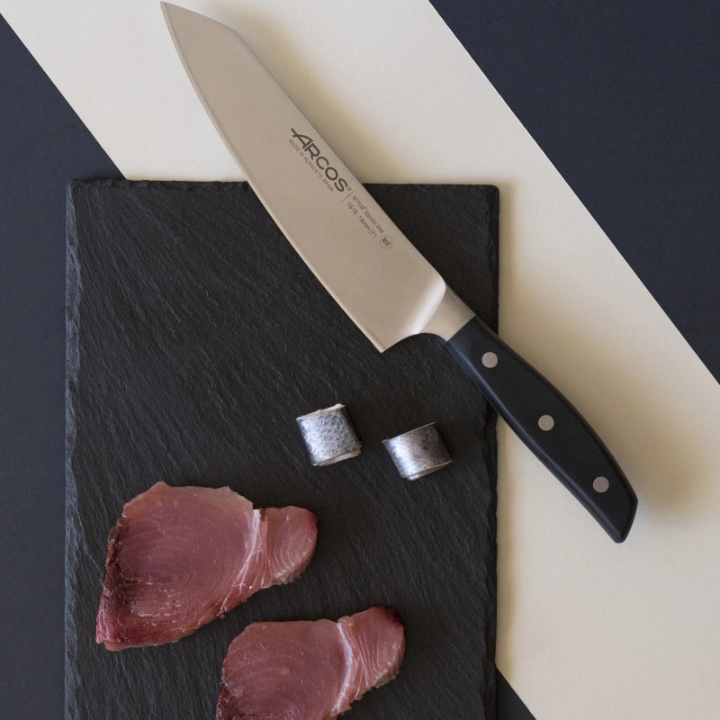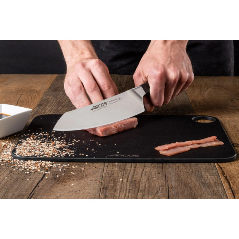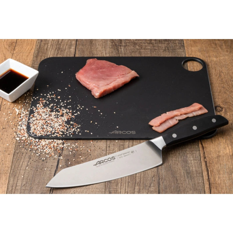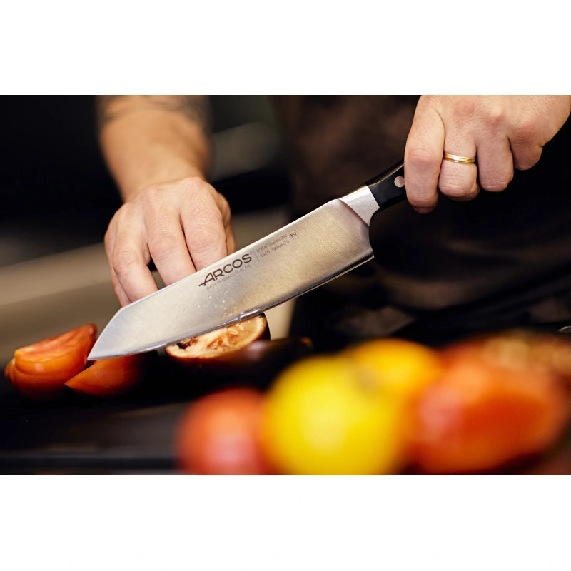 A faca Rocking Santoku é uma faca de alta qualidade forjada com os melhores materiais do mercado. Caracteriza-se por ser menor do que as facas de Chef e ter uma curvatura perfeita para picar e cortar. Foi fabricada em Albacete, Espanha, por mãos especializadas no setor de cutelaria desde 1734. A Arcos se destaca por combinar a melhor tradição com novas tecnologias.