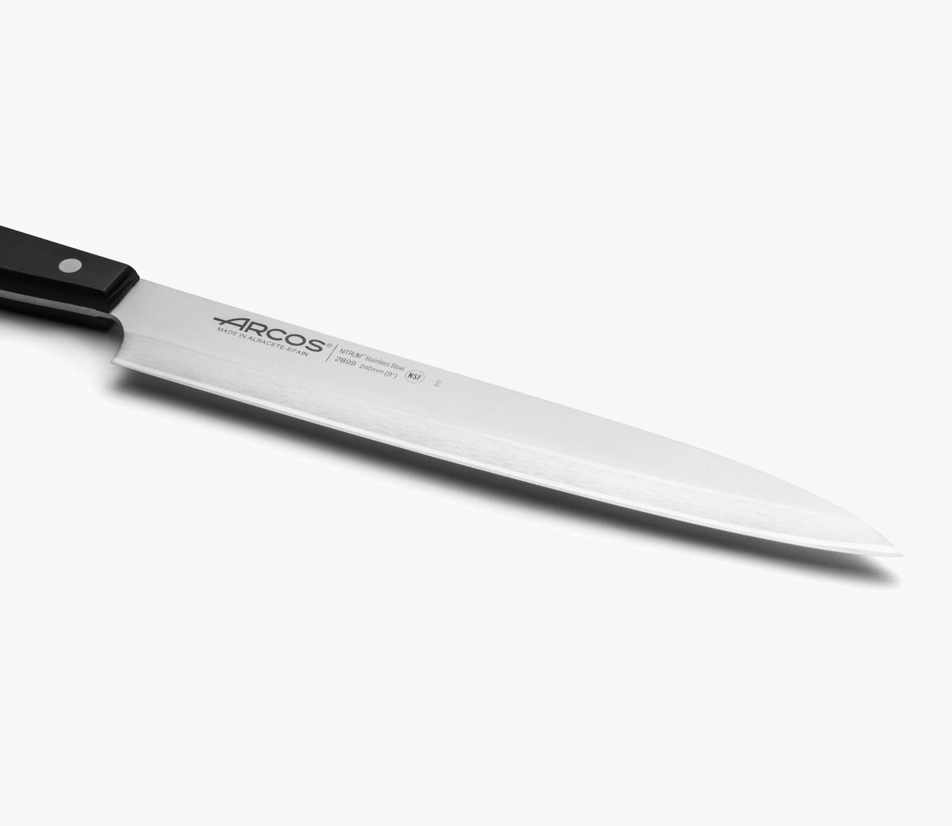 A faca Yanagiba da Série Universal de 240 mm permite obter cortes precisos em peixes crus, rolos de makisushi e sushi, graças ao seu bisel lateral de alto desempenho. Sua lâmina longa e fina, juntamente com sua ponta levemente curvada para baixo, lembra as espadas japonesas.