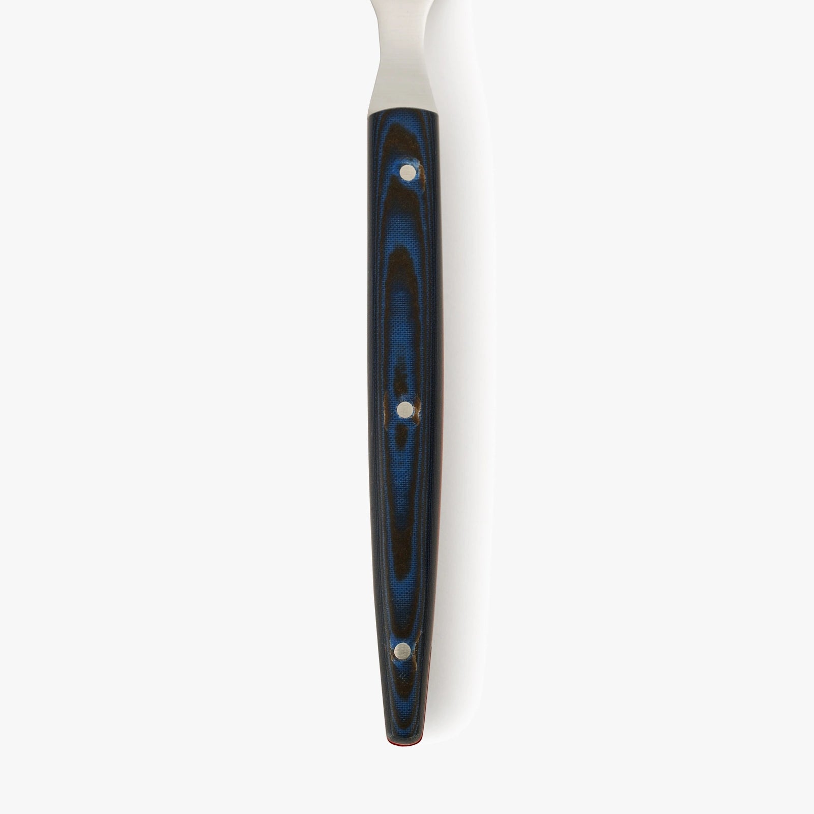 - Su característico diseño combina tonos azulados y remaches de acero inoxidable en su mango y pala, lo que lo convierte en una pieza única y distinguida en cualquier mesa.