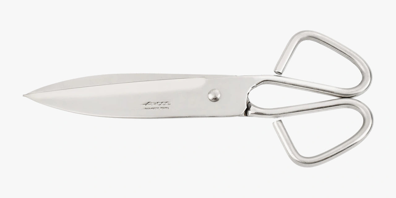 A primeira coisa que irá seduzi-lo nas tesouras de cozinha de 200 mm da Arcos é a sua cor cromada chamativa e limpa. Suas lâminas têm um estilo clássico, que contrasta com o design minimalista dos dedais, pois são finos e semi-fechados em direção às alças. É uma ferramenta culinária da família Ecopro, cujas principais características são seus acabamentos prateados e seu alto poder de corte.